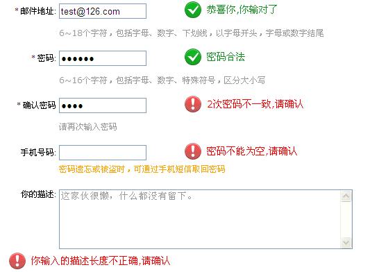 $("#ms").formValidator({onShowFixText:"",onShowText:"这家伙很懒,什么都没有留下。",ajax:true,onShow:"请输入你的描述",onFocus:"描述至少要输入10个汉字或20个字符",onCorrect:"恭喜你,你输对了",defaultValue:"这家伙很懒,什么都没有留下。"}).inputValidator({min:20,onError:"你输入的描述长度不正确,请确认"});
